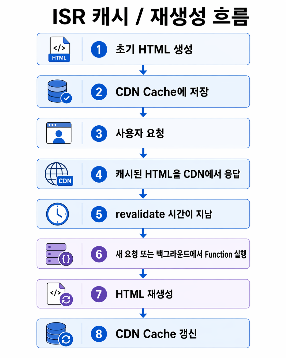 ISR을 사용하면 HTML 캐시와 재검증 로직을 플랫폼 캐싱 계층과 연결한다.