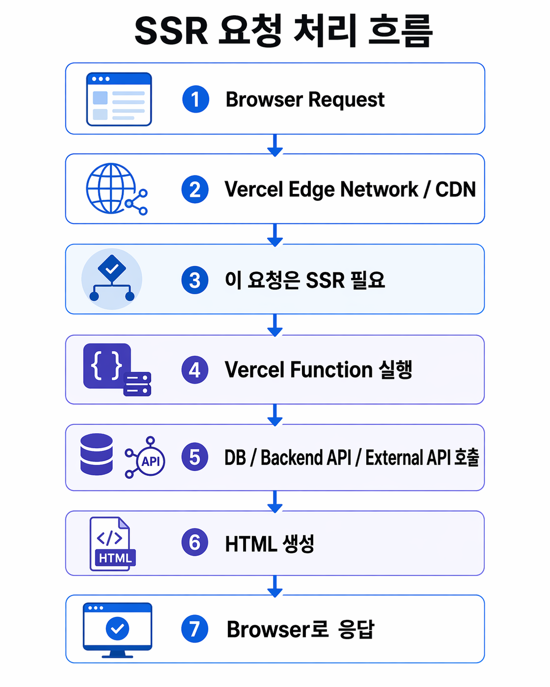 요청이 들어온 시점에 Vercel Function이 실행되고, 그 안에서 데이터를 가져온 뒤 HTML을 생성한다.
