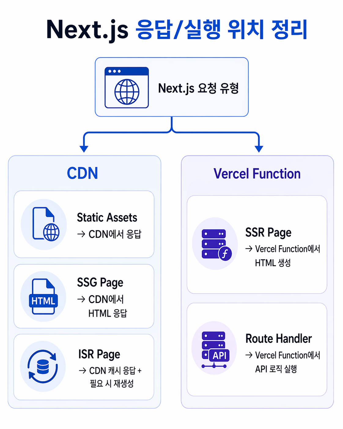 Next.js 코드가 어떤 렌더링 전략을 사용하는지에 따라, Vercel은 해당 결과물을 적절한 인프라 계층으로 자동 배치한다.